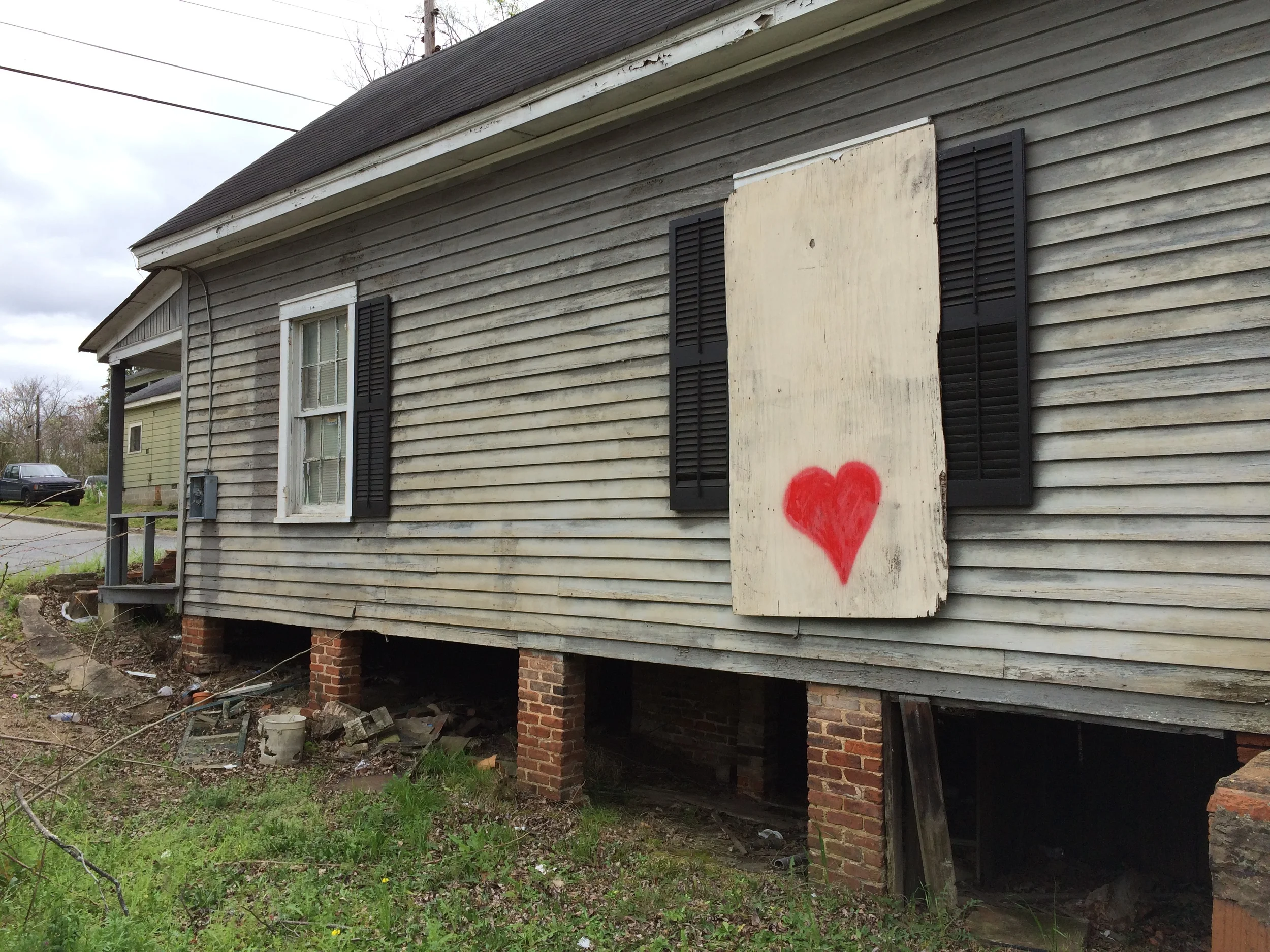 Macon, Georgia has a high number of buildings that have been abandoned and left looking for love. I painted hearts on some of these houses in the Pleasant Hill neighborhood, creating a visual reminder that these houses are loved and still filled with potential. Some of these hearts were even turned into larger messages by local artist Rudy Mendes that read “I [heart] Pleasant Hill.” This is the power of lightweight art in public space; it is approachable so everyone is able to engage with it and co-create their public spaces and their city.